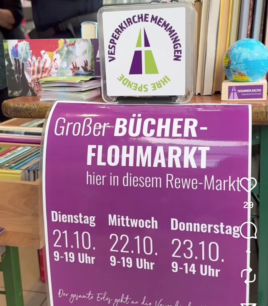 Ein ganz besonderer Dank geht an Frau Irene Pohl, die den Bücherverkauf als Ehrenamtliche des Evang.-Luth. Dekanats Memmingen organisiert und durchgeführt hat. Ein Dankeschön auch an Herrn Kutz vom REWE Markt, der den dafür benötigten Platz zur Verfügung gestellt hat.